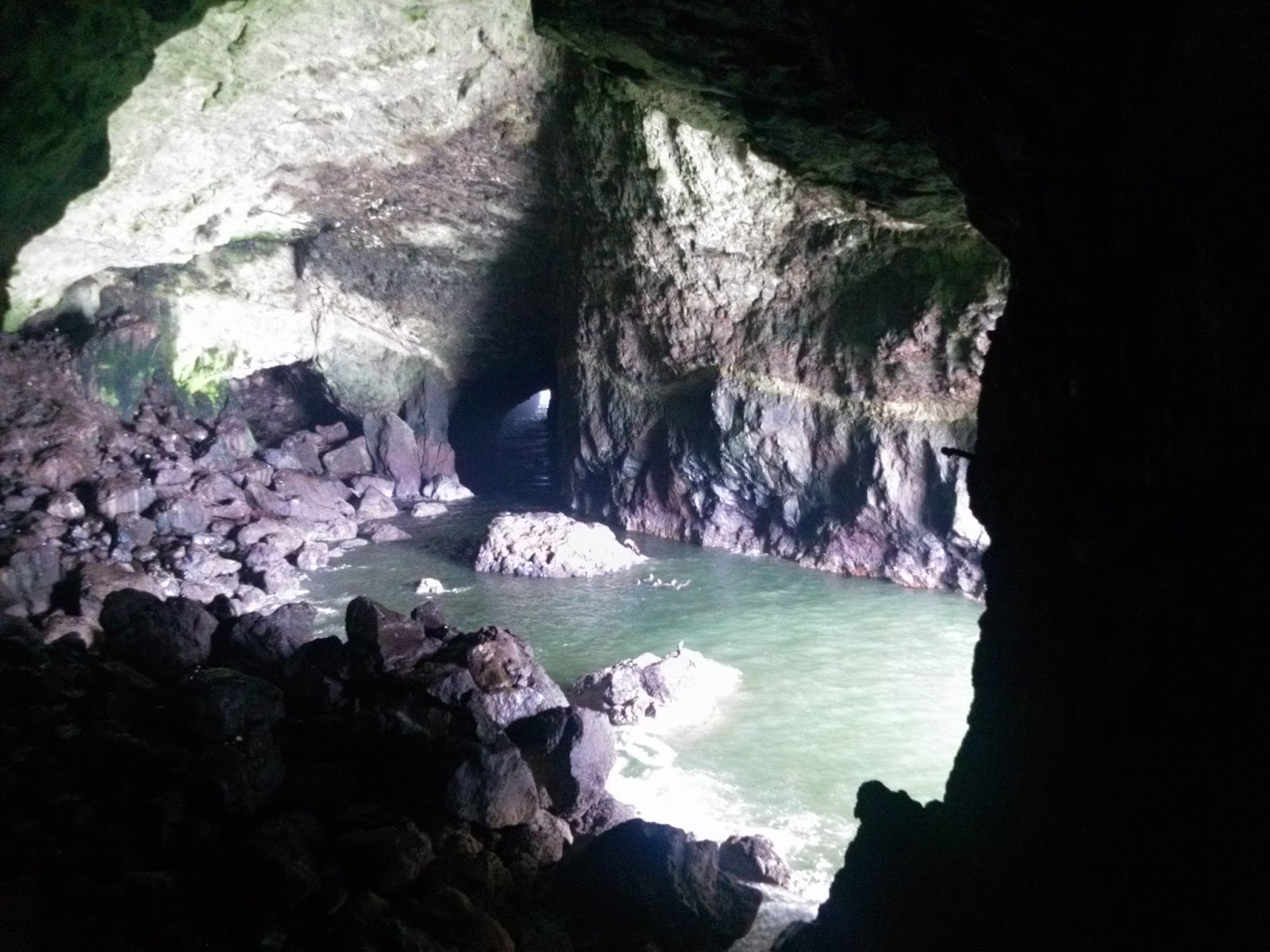 Inside of the cave itself. You can see a few sea lions swimming in the middle. During their breeding season, this room is packed full of them.