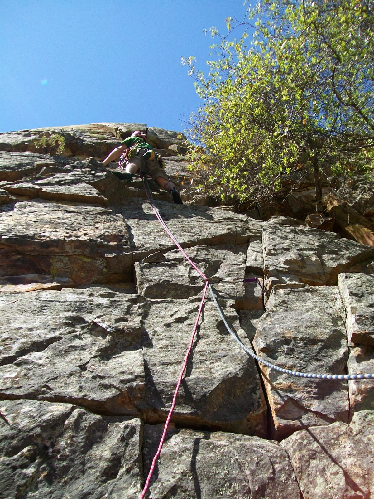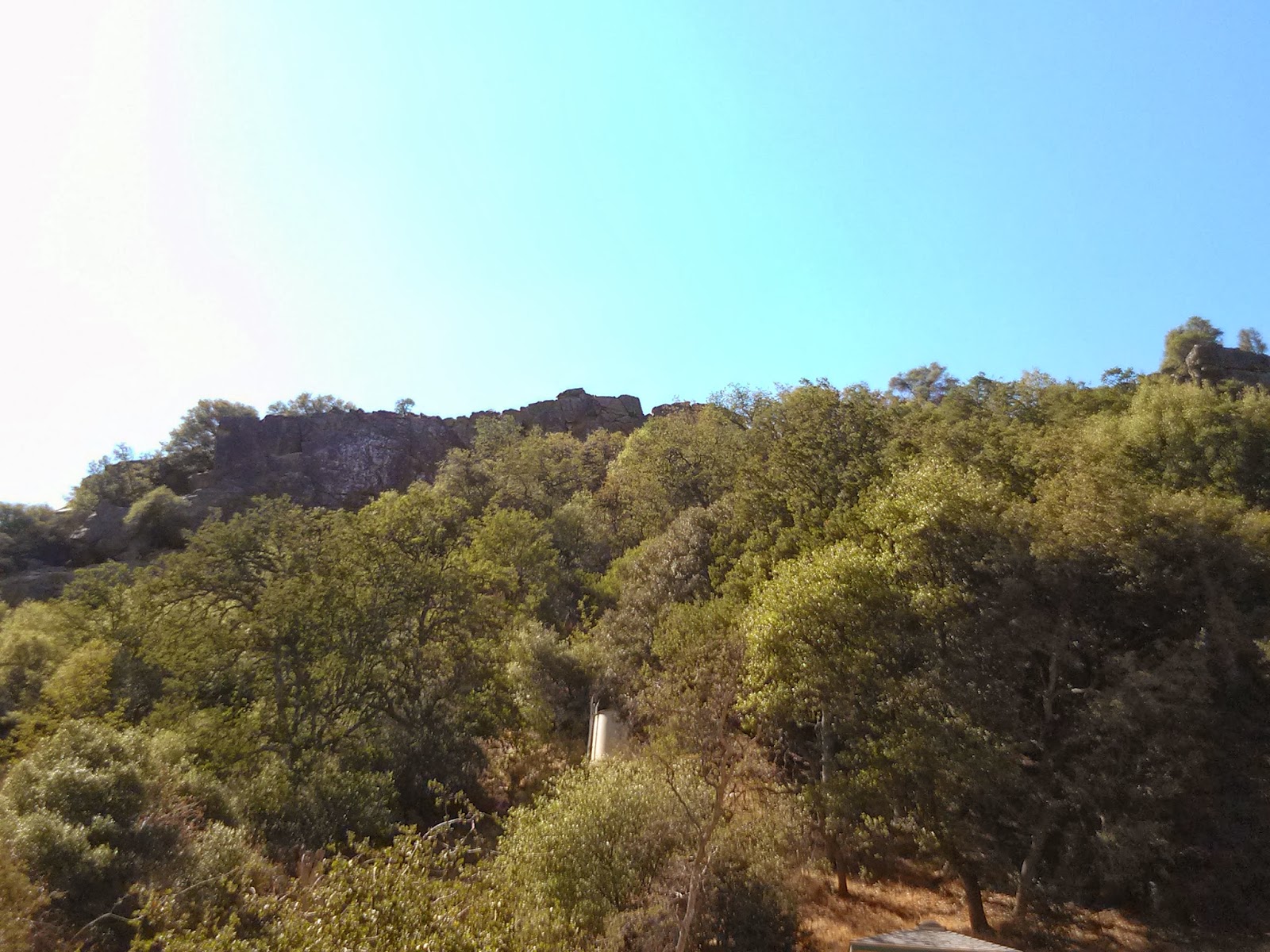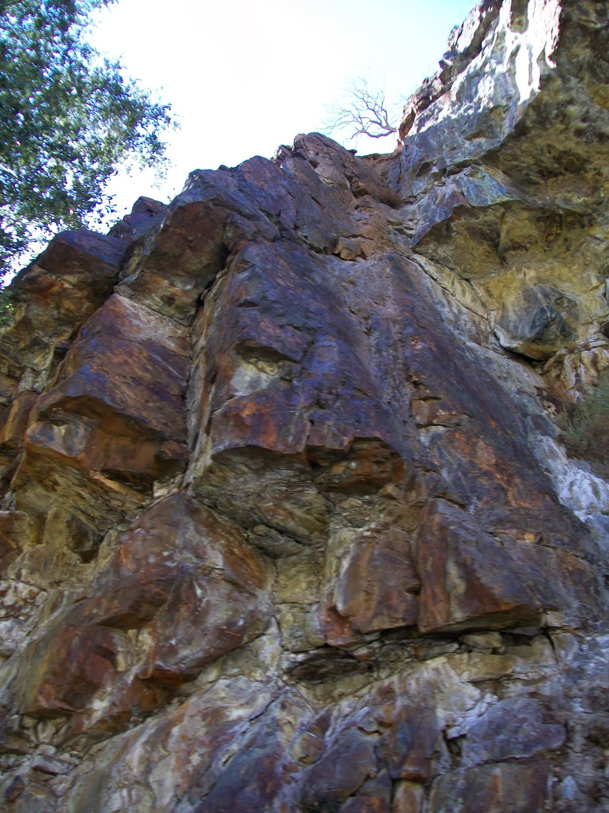 Here are pictures from rock climbing. We found a wall on the hillside above the Hospital Rocks parking lot and found a route that we could trad climb. Here is a shot of part of the wall from the parking lot. Our route was near the right side.