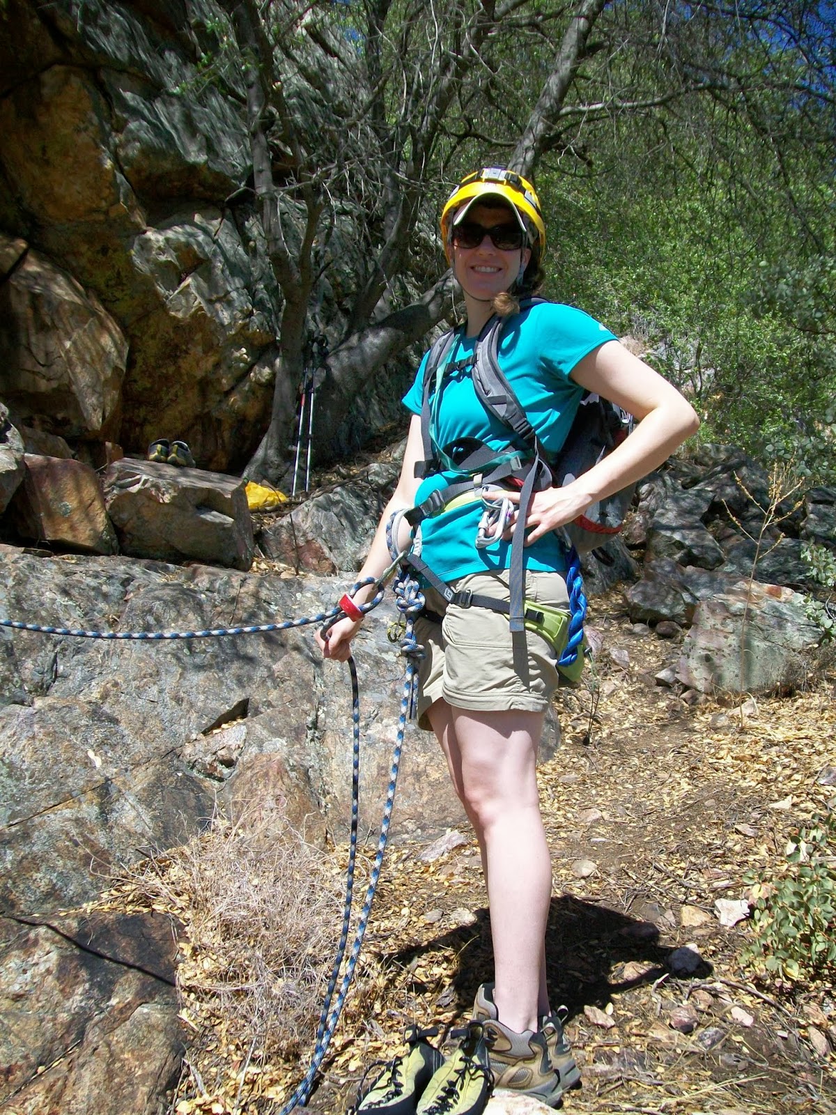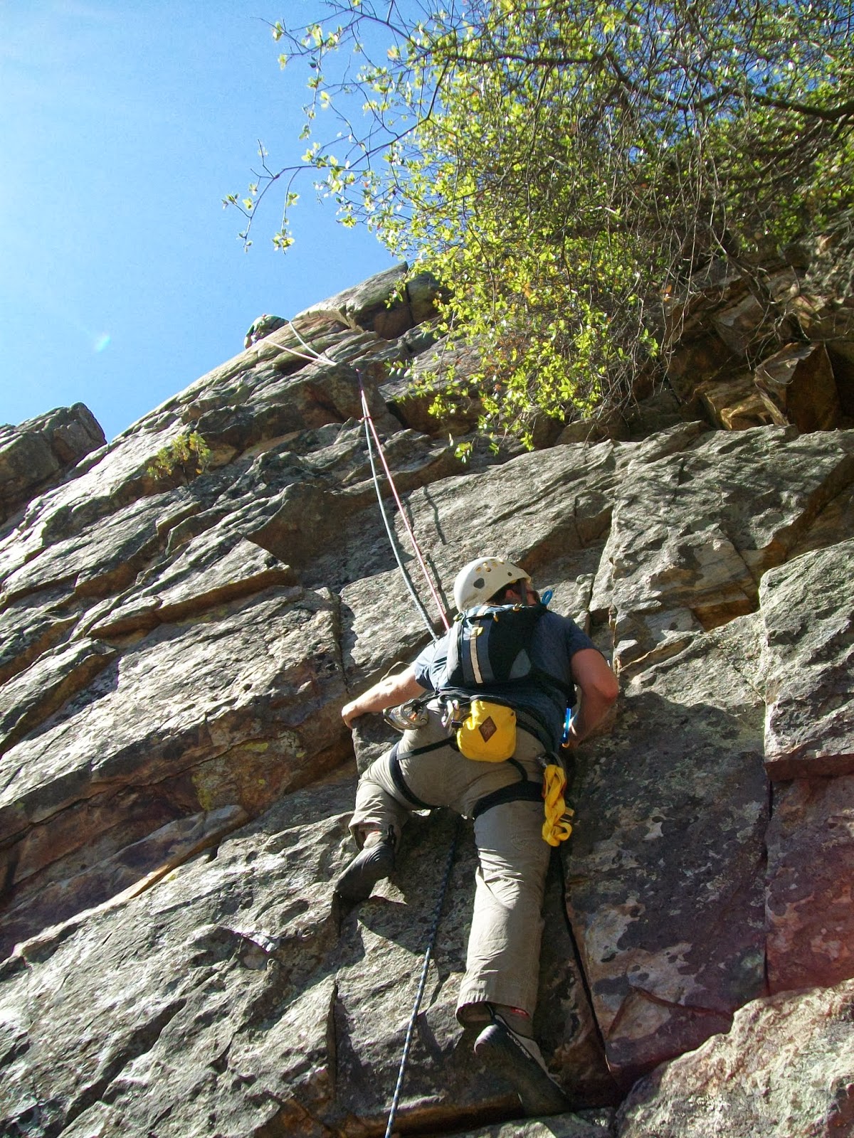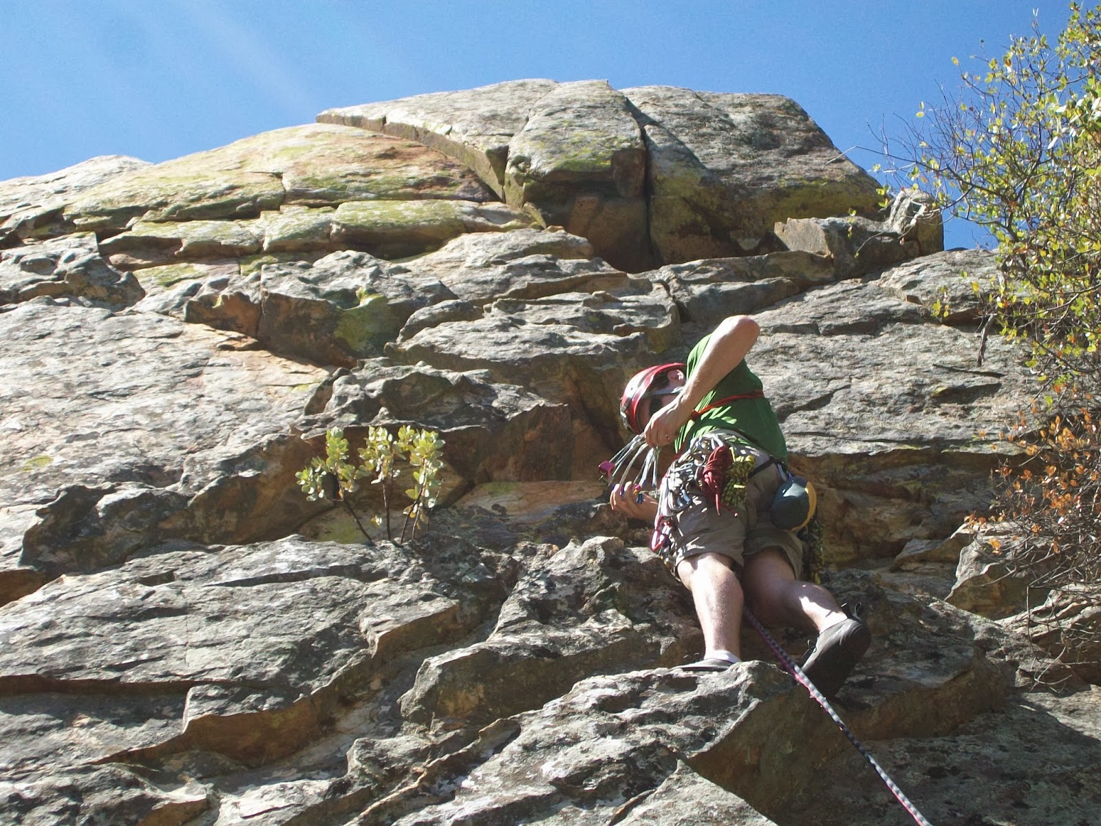 Here are pictures from rock climbing. We found a wall on the hillside above the Hospital Rocks parking lot and found a route that we could trad climb. Here is a shot of part of the wall from the parking lot. Our route was near the right side.
