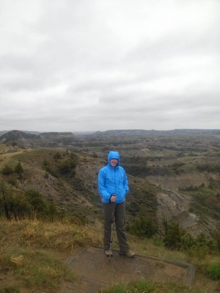 Woman in green sweater and brown hiking pants stands above a view of the badlands of the Theodore Roosevelt National Park South Unit.