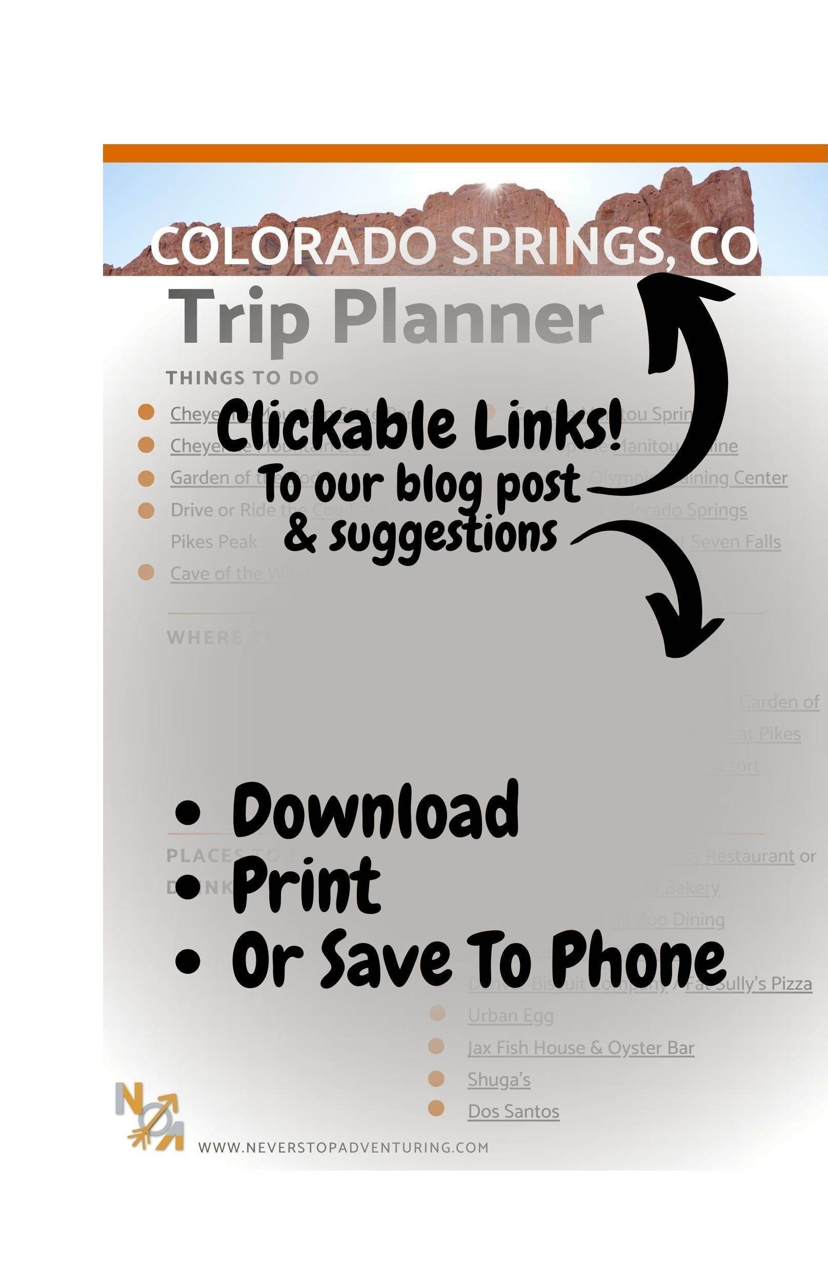 Colorado Springs Trip Planner, with all the things to do, places to stay, and where to eat on one easy to reference page with links.